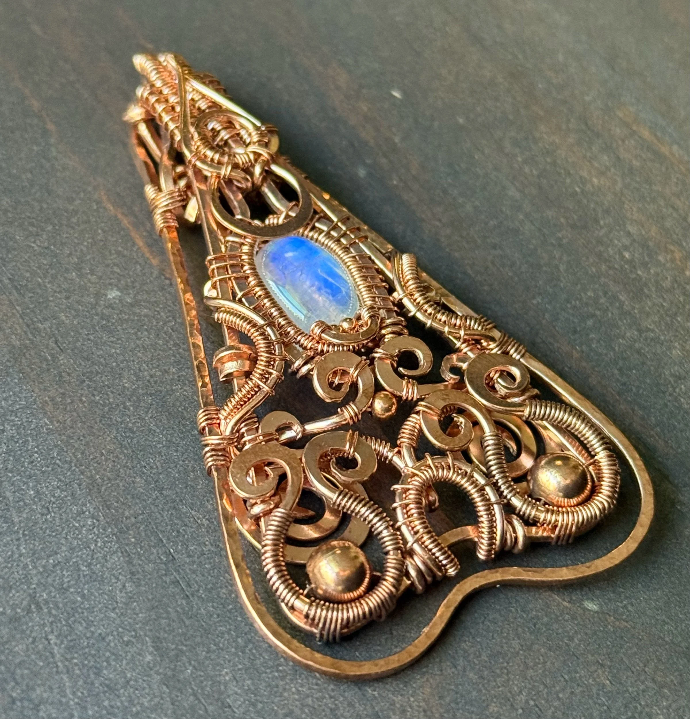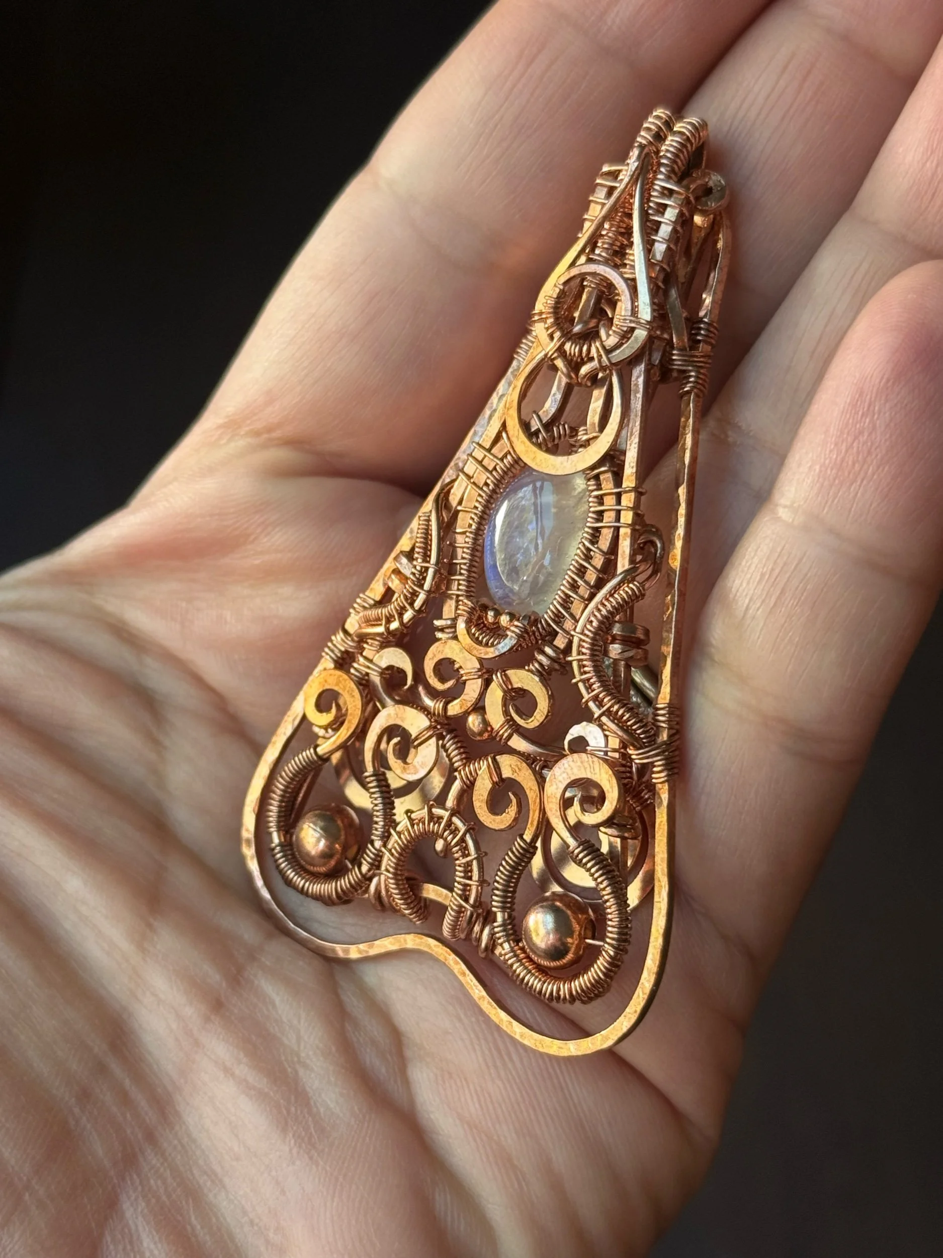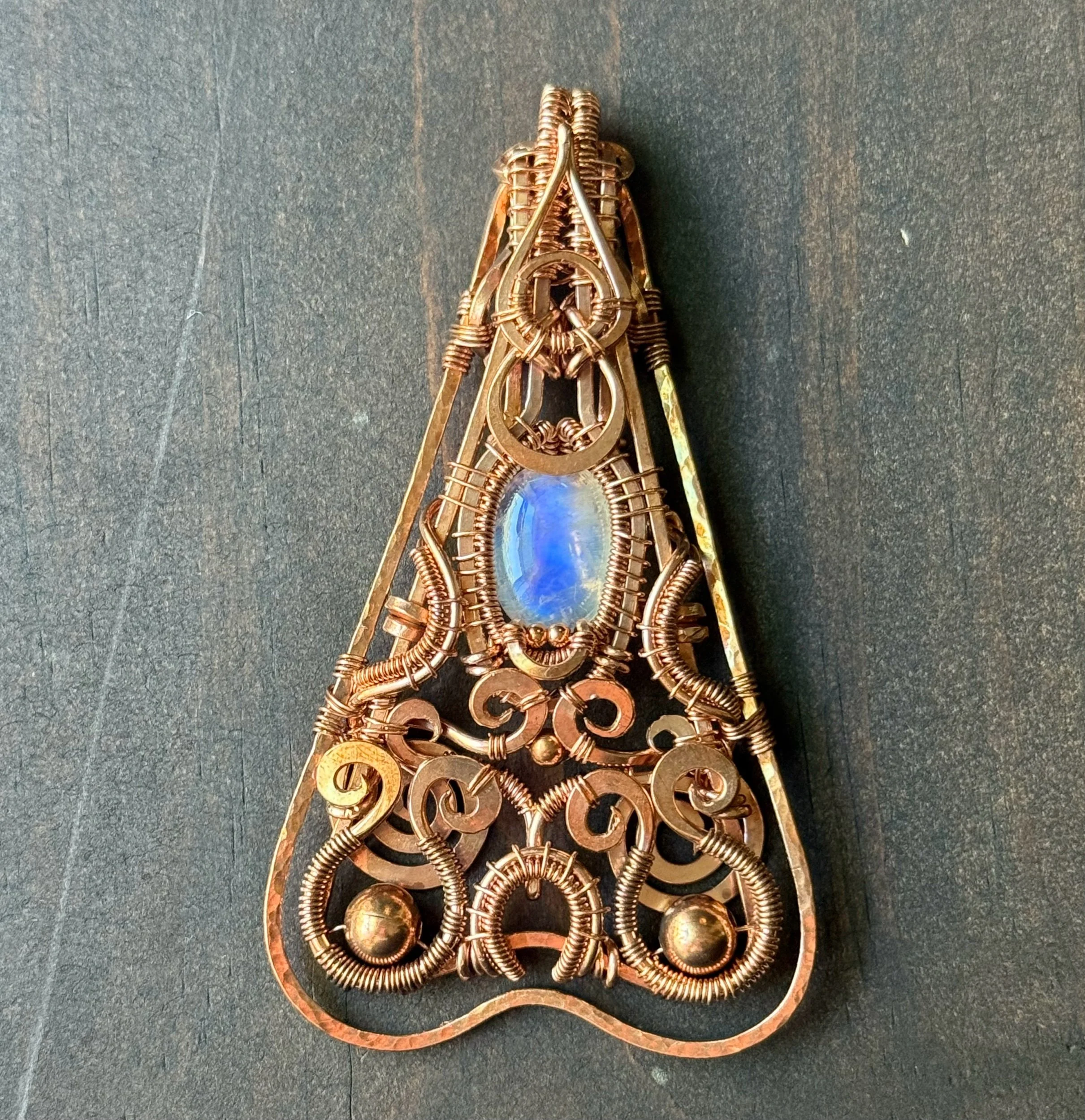This intricately wrapped copper amulet is paired with two guardian stones, obsidian and turquoise (Arkansas Mona Lisa).