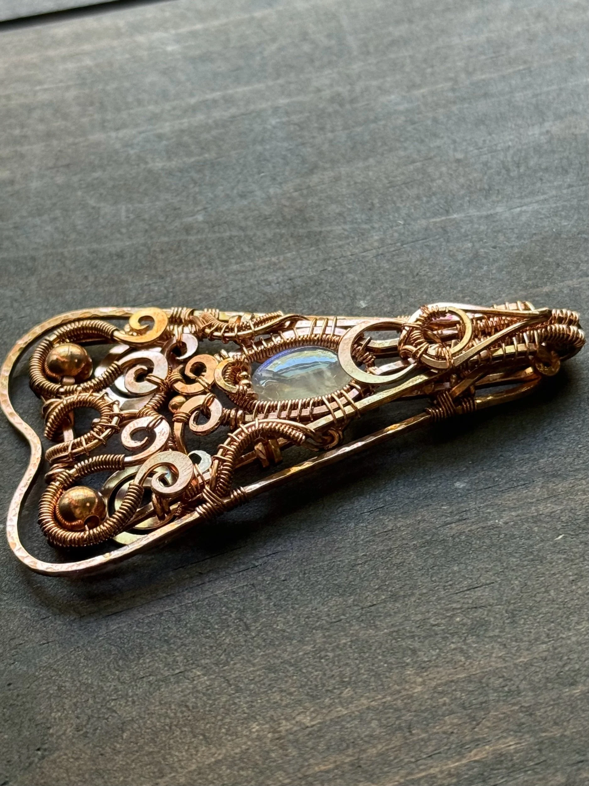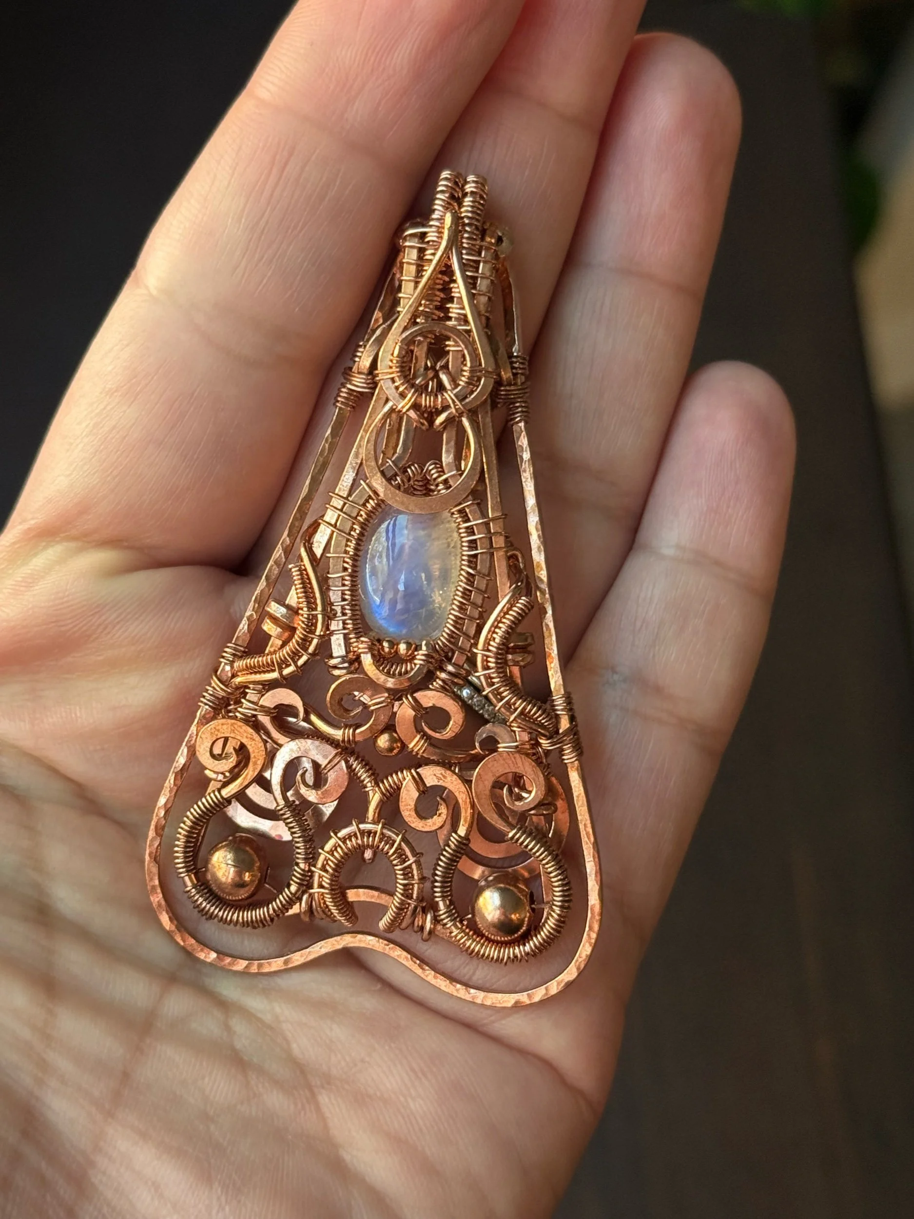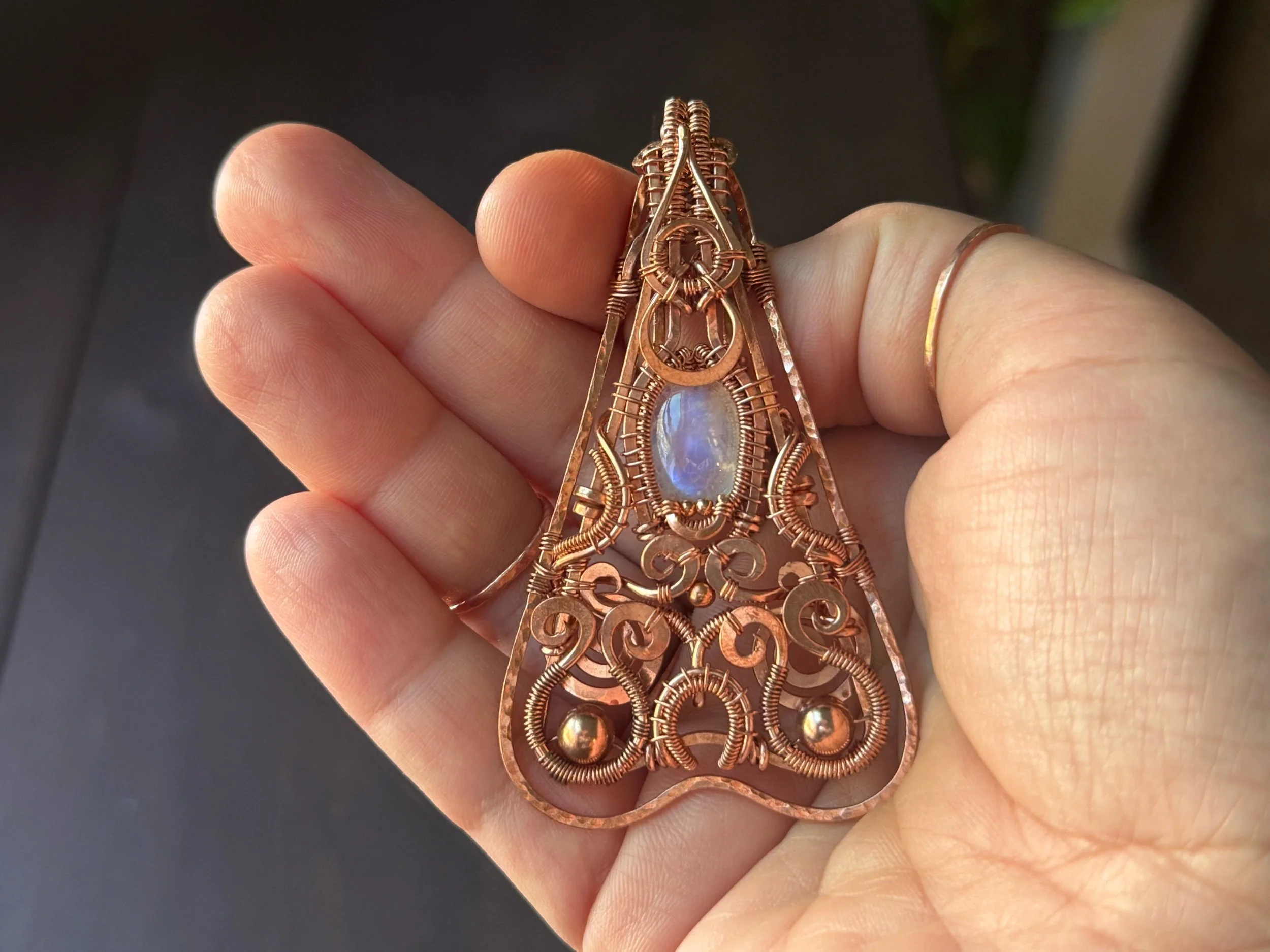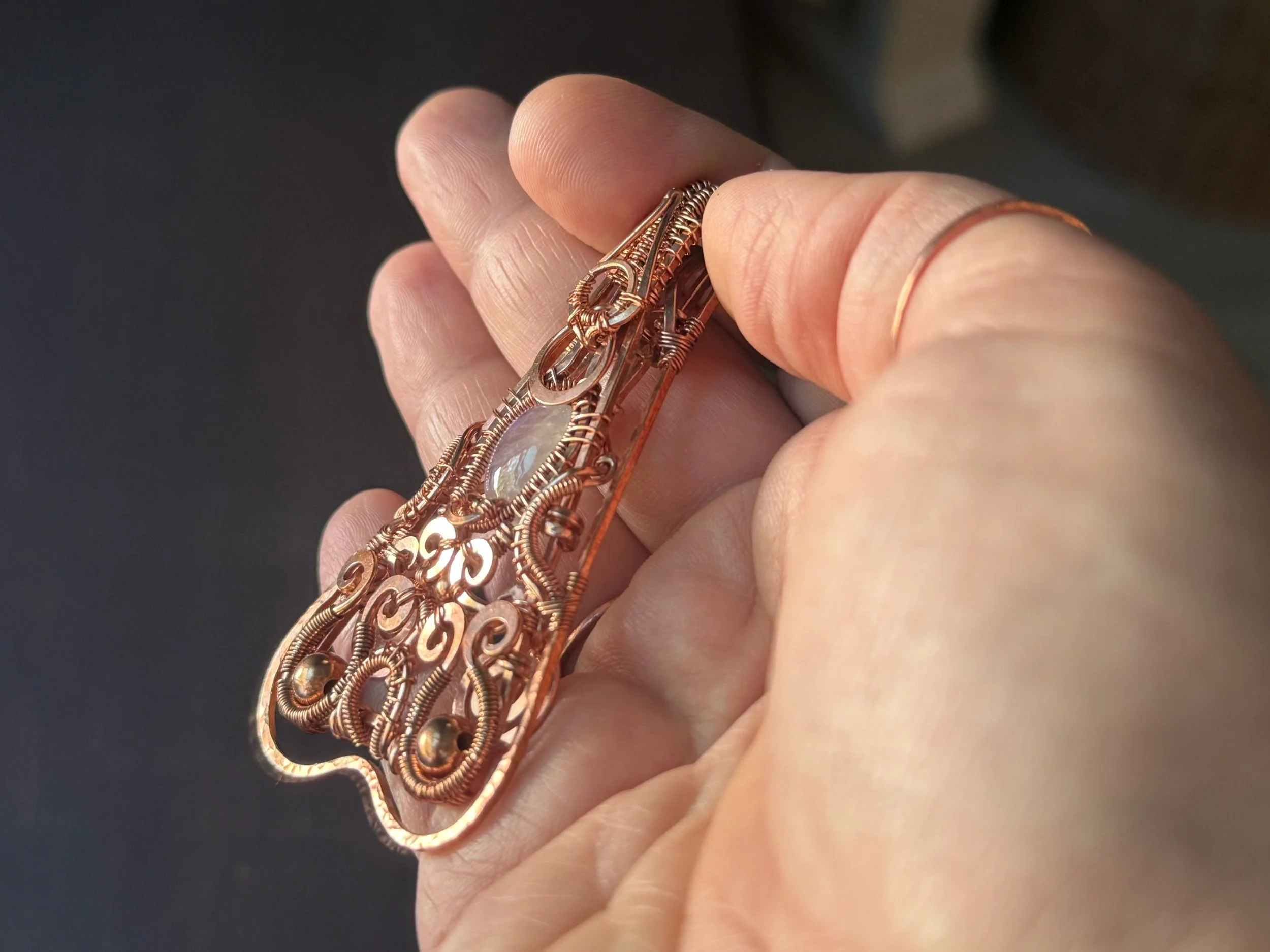 This intricately wrapped copper amulet is paired with two guardian stones, obsidian and turquoise (Arkansas Mona Lisa).